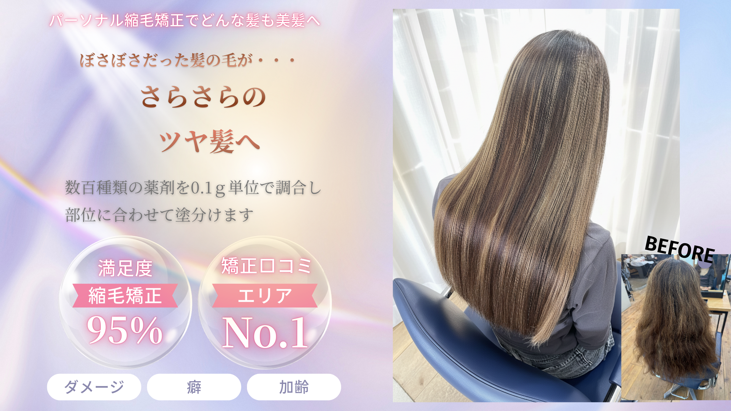 当サロンはお客様の髪質を見極めて頭の部位別に数百種類の薬剤から0.1グラム単位で調合して施術を行います。今までの仕上がりに満足いかなかった方はぜひご相談ください。